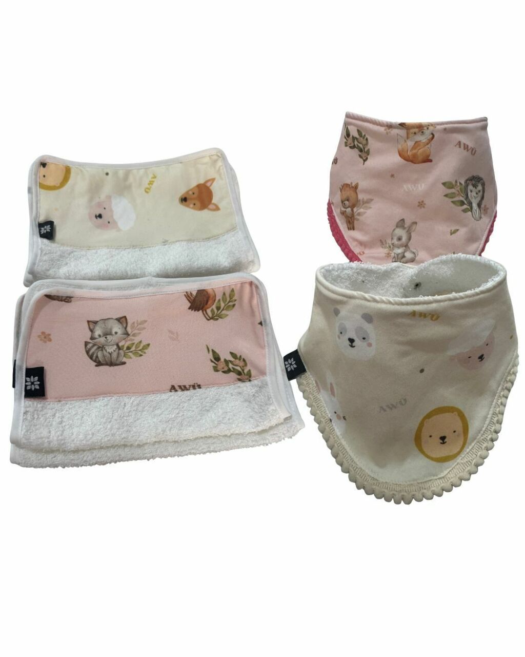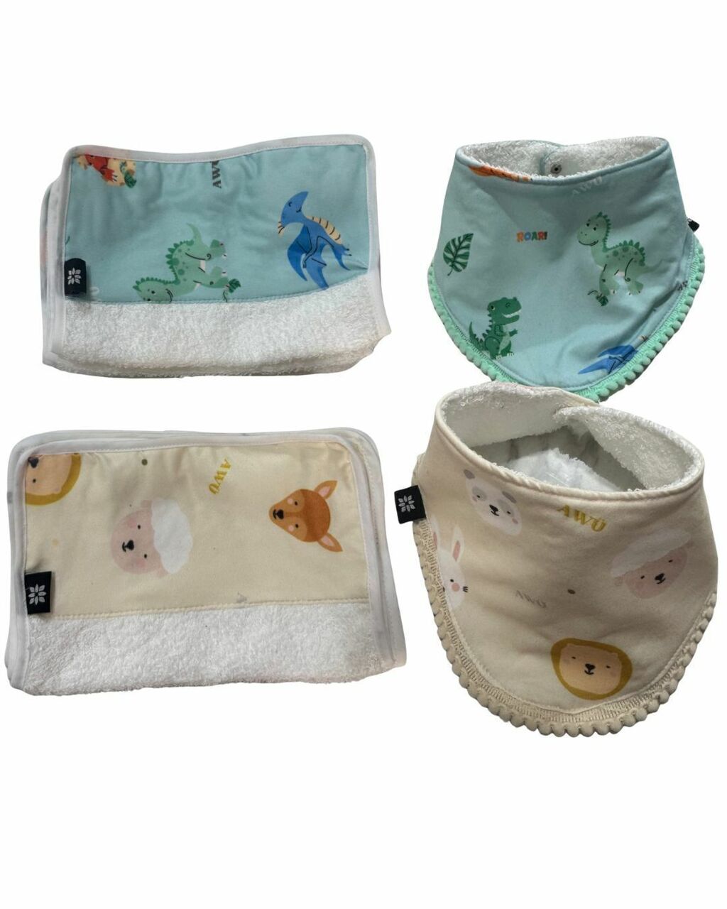 • 2 baberos con frente de algodón soft 100% hipoalergénico y reverso de toalla doble súper absorbente BROCHE ACERO A PRESION.